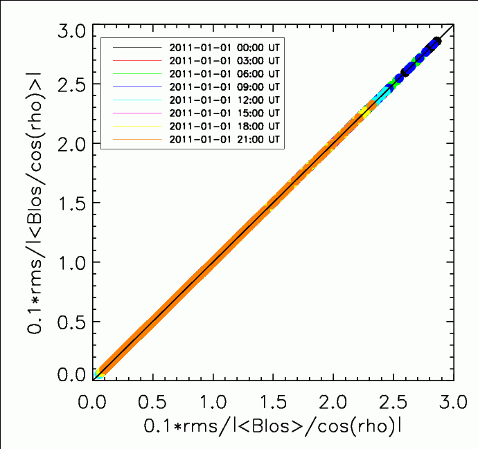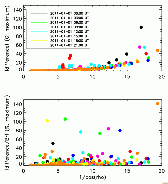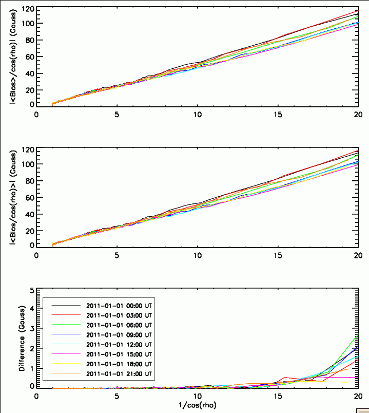 Median and rms of the points on each circles are calculated. Data used are at evrey three hours on 2011-01-01. Fig. 1 shows medians of absolute values of Br derived by Method B (top panel), Method A (middle), and their difference (bottom; Method B - Method A), as a function of 1/cos(ρ). The maximum ρ in this analysis is about 87.13 degree. As expected, median of magnetude of Br increases toward the limb, mostly due to increase of 1/cos(ρ) that is applied to convert Blos to Br. Difference between the two methods is very small within ρ = 84.3 degree (1/cos(ρ) = 10.0 in the plot). Mean of the differences at ρ = 84.3 degree from those eight dataset is 0.05 Gauss. The difference increases to 2.1 Gauss on average at ρ = 87.13 degree.
