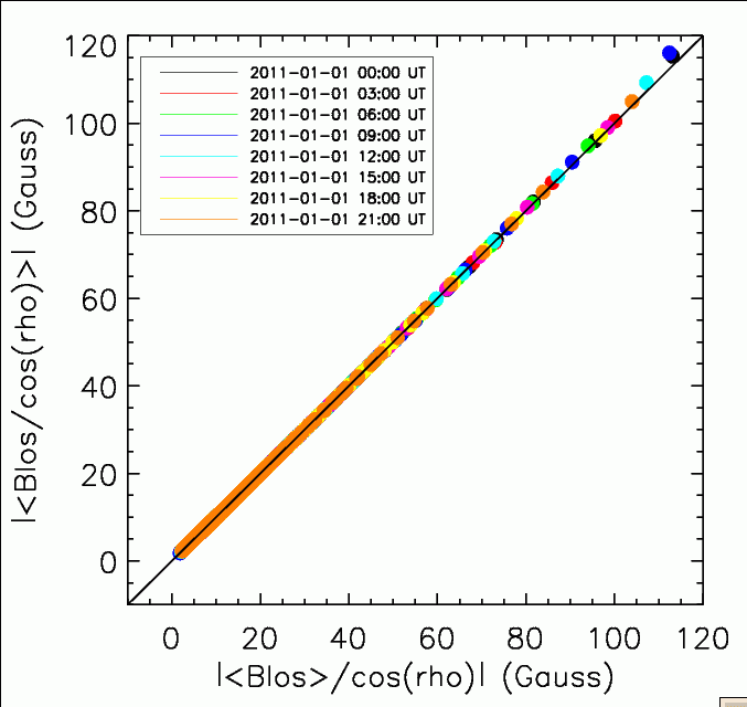 Test is designed as follows. Choose HMI full-disk 720-s line-of-sight magnetograms. Convert Blos to Br. In this way, we have pairs of Br and Blos on image coordinates. Draw circles with respect of the disk center for each pair. ρ is the same at each circle. For each point (x, y) on one circle, do cubic convolution on Br image to derive Br(x,y) = 〈Blos/cos(ρ)〉, and on Blos image and then divided by cos(ρ) to obtain Br(x, y) = 〈Blos〉/cos(ρ). Statistical analysis is performed with those points on this circle.